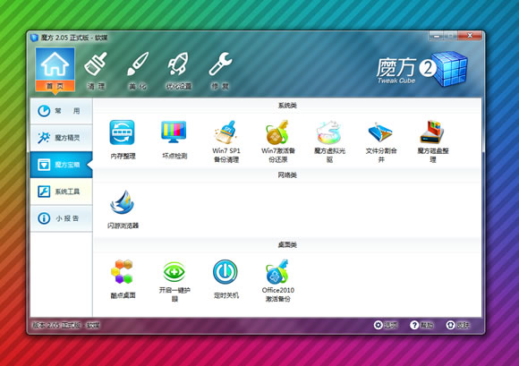 魔方:全新一代優(yōu)化大師,世界首批通過微軟官方Windows7徽標(biāo)認(rèn)證的系統(tǒng)軟件,多項(xiàng)國內(nèi)頂級獎項(xiàng),是現(xiàn)在國內(nèi)用戶量第一的Vista優(yōu)化大師和 Windows7優(yōu)化大師的全新一代專業(yè)系統(tǒng)級應(yīng)用軟件,功能全面覆蓋Windows系統(tǒng)優(yōu)化、設(shè)置、清理、美化、安全、維護(hù)、修復(fù)、備份還原、文件處理、磁盤整理、系統(tǒng)軟硬件信息查詢、進(jìn)程管理、服務(wù)管理等等,內(nèi)置微軟認(rèn)證數(shù)字證書,采用C++開發(fā),魔方完美支持64位和32位的Windows7、 Vista、XP、Windows2008、2003、2000所有主流操作系統(tǒng)。數(shù)十項(xiàng)獨(dú)家和千余項(xiàng)實(shí)用功能,是目前世界范圍內(nèi)執(zhí)行效率最高的一款頂級綜合型系統(tǒng)軟件。魔方 2.05 更新歷史: