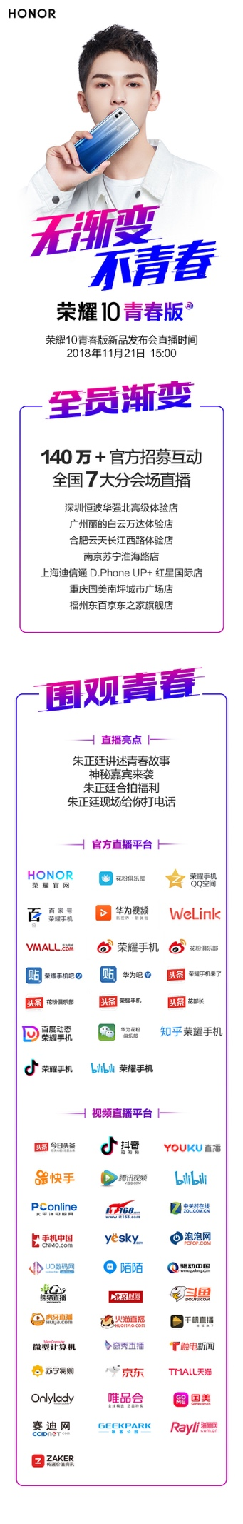 以朱正廷的超高人氣來看,現場的氛圍一定會非常的火爆,榮耀10青春版發布會恐怕是要一票難求。更何況榮耀10青春版自公布以來,就憑借獨樹一幟的漸變色和2400萬AI自拍,引來無數網友的關注和響應,相信有很多粉絲也會因此更加期待11月21日的發布會。據悉,發布上還會有神秘嘉賓現身、朱正廷現場打電話等等玩心跳玩刺激的環節,想想都是期待感炸裂、粉絲福利爆棚呢!珍珠糖們,搬好小板凳坐等明天的直播吧!
