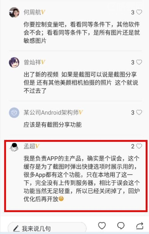 于斌在文中表示,他在關(guān)注該事件后馬上也做了相同測試,但沒有復(fù)現(xiàn)這個(gè)問題。他表示在京東金融內(nèi)截圖,雖然發(fā)現(xiàn)這個(gè)應(yīng)用確實(shí)在監(jiān)聽用戶的截圖行為,但是這個(gè)行為是為了方便調(diào)用客服和分享,是行業(yè)內(nèi)普遍做法,并不具備惡意。以下是于斌個(gè)人文章的詳細(xì)內(nèi)容: