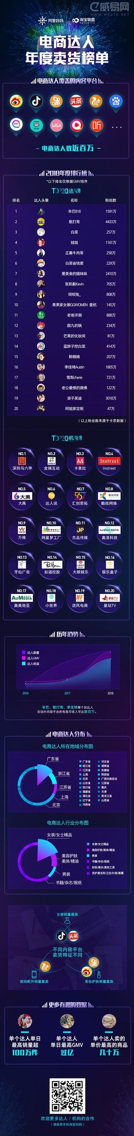 榜單上的電商達人均是淘寶客,即通過CPS方式在淘外內容平臺賣貨的電商達人。榜單誕生的依據維度是2018年真實產生的成交額排名。也就是說,粉絲量不是判斷帶貨能力的最重要指標,粉絲量大但不賣貨也不算電商達人,一切得拿實力說話。