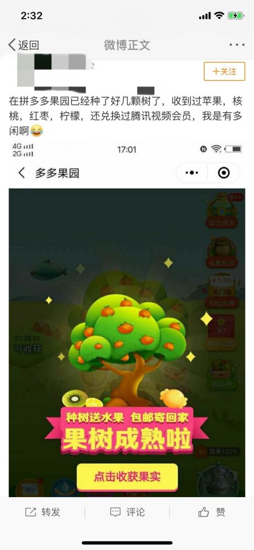▲不少拼多多的用戶在“多多果園”果實成熟的時候,會曬出收獲的喜悅。