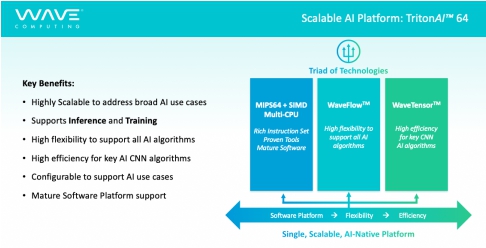 2019 年,Wave Computing針對邊緣計算市場的算力需求,將MIPS技術(shù)與Wave旗下WaveFlow™和WaveTensor™技術(shù)相結(jié)合,推出TritonAI™ 64 IP平臺,該平臺融合了Wave Computing旗下的幾大核心技術(shù),MIPS 高性能、多線程、低功耗 IP、WaveFlow™、WaveTensor™等先進(jìn)技術(shù),具有高可擴(kuò)展性、高兼容性、可客制化的特點,為產(chǎn)品提供高效、低耗的AI計算加速能力。