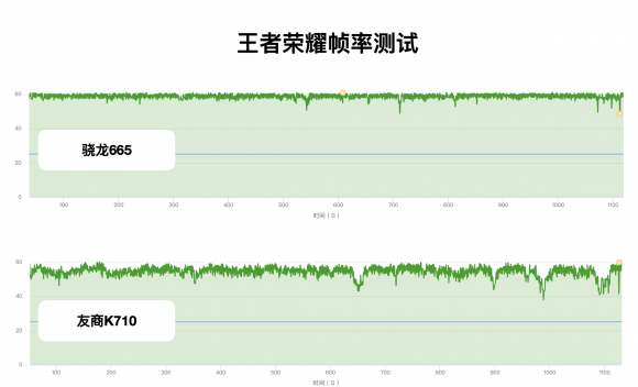 而相同畫面設置下,同樣視角運行同一局游戲,采用K710芯片的手機平均幀率54.3fps,在遇到團戰或者施放畫面效果較為復雜的技能時,會出現不同程度的掉幀卡頓。