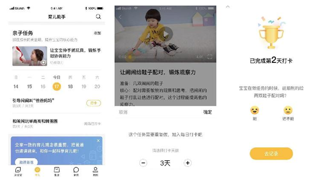 從形式上看,“親子任務”從單純的智能化推薦升級為“AI智能任務排期+家長個性化添加”的方式來設定每日打卡的內容,一旦任務設定完畢,一個周期內的打卡任務便一目了然。對于寶寶的能力培養,大多數項目需要反復練習才能夠學會。對此,親寶寶專家團表示,“當家長點擊‘加入每日打卡’按鈕之后,頁面上顯示的其實就是我們的建議打卡天數,以及打卡頻率。