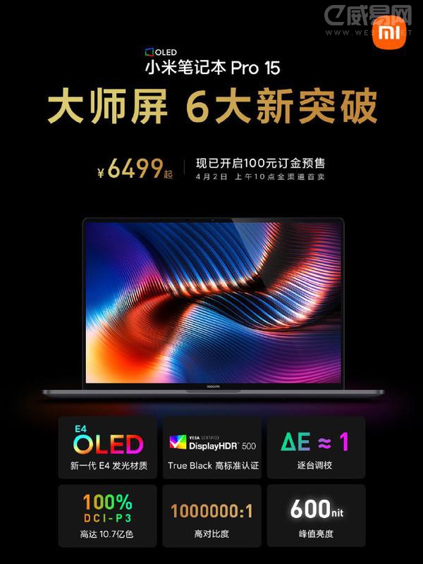 在日前的小米春季新品發布會上,小米發布了不少新品,包括小米筆記本Pro 15。官方介紹稱,該筆記本是一款高性能輕薄本,配備了一塊E4 OLED屏幕,刷新率高達3.5K,多項數據都刷新了行業的最高標準,“堪稱史上最好的小米筆記本屏幕”。小米筆記本Pro 15售價6499元起,已于4月2日10點正式首賣。