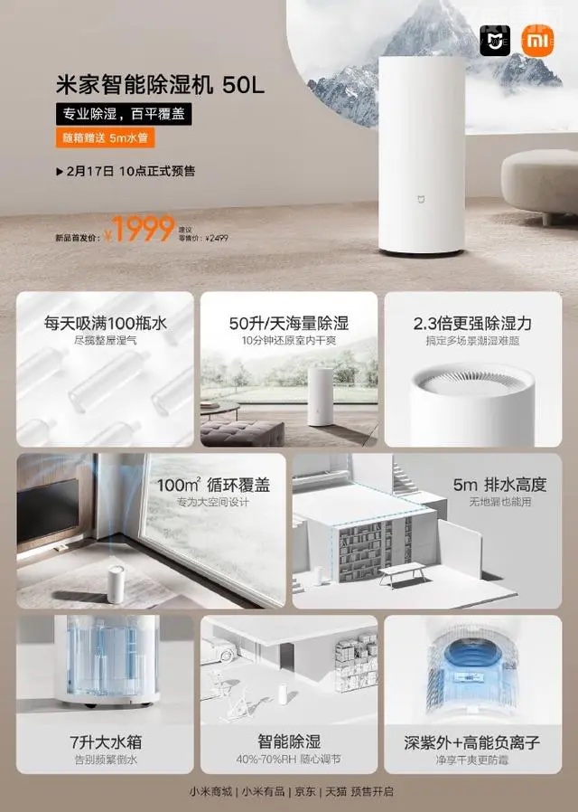 小米最近發(fā)布了米家智能除濕機(jī)50L,適用于別墅復(fù)式、新裝修房、地下酒窖、公共空間以及倉庫商鋪等場所,能夠覆蓋百平空間,擁有2.27倍更強(qiáng)的除濕力,解決多場景潮濕問題。預(yù)售價(jià)為1999元。