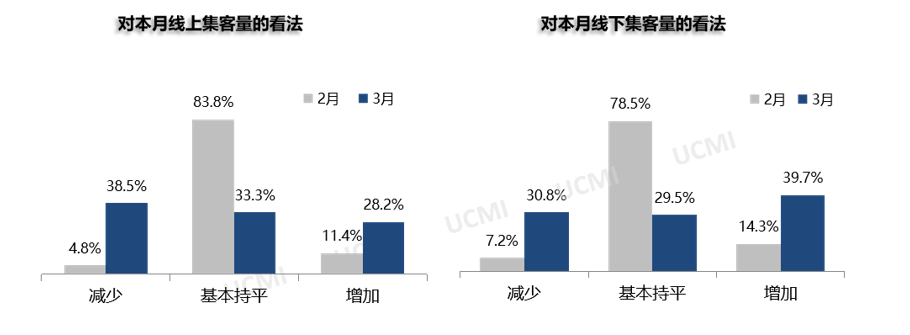 調(diào)查顯示,3月份線(xiàn)上集客量有所減少、線(xiàn)下集客量有所增加。其中認(rèn)為線(xiàn)上集客量“減少”的二手車(chē)經(jīng)理人比例為38.5%;認(rèn)為線(xiàn)下集客量“增加”的二手車(chē)經(jīng)理人比例為39.7%。