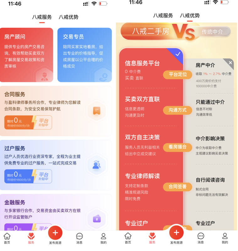 在八戒二手房App上,業主將房源掛在八戒二手房之后,買家可以在平臺上找到房源,直接同業主交流并交換聯系方式從而私下進行交易。八戒二手房平臺在溝通看房和交易過戶的環節,八戒二手房加入了法律、交易過戶等等多個流程服務。從服務內容角度上看,盡管八戒二手房打出了0中介費和“非中介機構”的概念,本質上還是充當了和房產經紀完全一致的角色,可以把他理解為消費者買賣房產路上的“免費管家”。