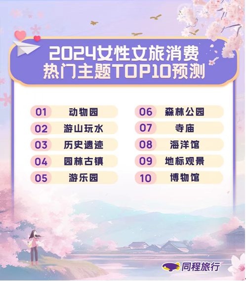 同程旅行平臺文旅消費大數據的分析預測顯示,2024年度女性消費者文旅消費熱點將主要集中于動物園、游山玩水、歷史遺跡、園林古鎮、游樂園等十個主題,與往年同期基本一致。分年齡看,“80后”、“90后”女性的文旅消費偏好更多集中于適合親子及家庭出游的主題景區,例如動物園、游樂園等,而“00后”女性的文旅消費則相對更集中于適合獨自玩樂或適合閨蜜游及情侶一起出游的主題上,例如寺廟祈福類、演出賽事及其他一些休閑碎片化產品。