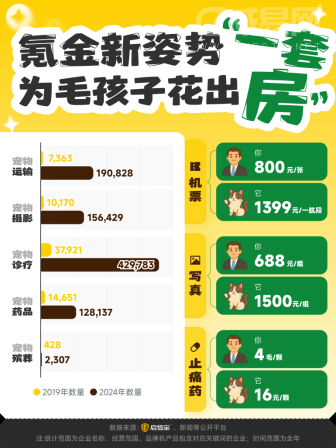 某頭部電商平臺(tái)聯(lián)合產(chǎn)業(yè)發(fā)展研究院對(duì)養(yǎng)寵人的調(diào)研結(jié)果顯示,65%的養(yǎng)寵人會(huì)為愛(ài)寵定制專屬食譜,近40%家庭計(jì)劃攜寵旅行,26%選擇為它們拍攝寫(xiě)真留念。養(yǎng)寵人正將原本屬于人類的精致服務(wù),完整“復(fù)制”到毛孩子身上。啟信寶數(shù)據(jù)顯示,截至2024年底,聚焦寵物運(yùn)輸、攝影、診療等新型服務(wù)的企業(yè)總量已突破90萬(wàn)家。其中,寵物運(yùn)輸領(lǐng)域企業(yè)數(shù)量在6年間暴漲近25倍,寵物攝影領(lǐng)域企業(yè)數(shù)量增長(zhǎng)14倍,成為增長(zhǎng)最迅猛的兩大“新賽道”。