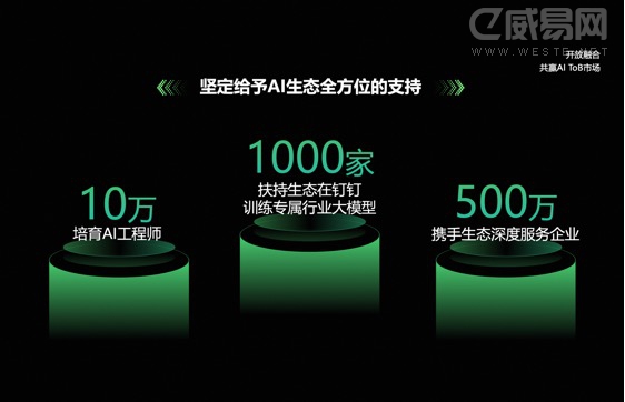 “釘釘開放平臺已經從全面開放、生態融合正走向All IN AI。”易統表示,“釘釘將從人才、數據、模型、Agent、商業環境等方面,打造合作伙伴用得起來、能夠取得商業成功的AI開放平臺,共同服務中國6100萬企業與創新組織”。