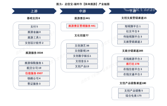 啟信寶產業鏈數據進一步量化了湖州文旅的“家底”。根據啟信寶數據,湖州全市休閑旅游產業鏈企業總數達4540家,其中上游住宿服務環節企業最多,數量為3507家,占全產業鏈企業總數的77%,數量排第二的是中游旅游景區管理服務企業,有441家。數量龐大的酒店與特色民宿,依托湖州獨特的山水風光,共同支撐起湖州“休閑度假”的旅游核心競爭力。