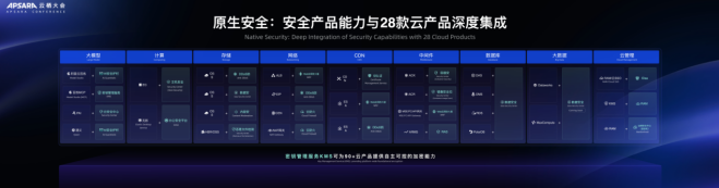 會上,阿里云同時宣布已有28款云核心產品深度集成云安全能力。將安全能力融入到云產品中,降低用戶使用門檻,未來還會進一步提升集成產品數量。