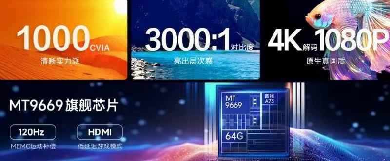 3.畫質(zhì)越級: 1000 CVIA真實高亮搭配3000:1超高對比度,打破千元投影“見光死”魔咒;