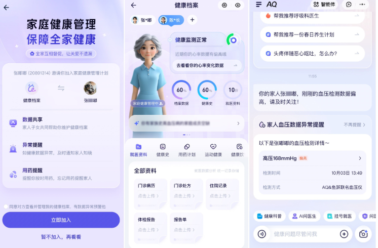 為此,AQ提供“家庭健康檔案共享”功能,父母的病歷或體檢報告也能存在AQ里,子女隨時能看、能管、能提醒,當某天醫生問起“爸媽有啥過敏史”的時候,也能準確回答。
