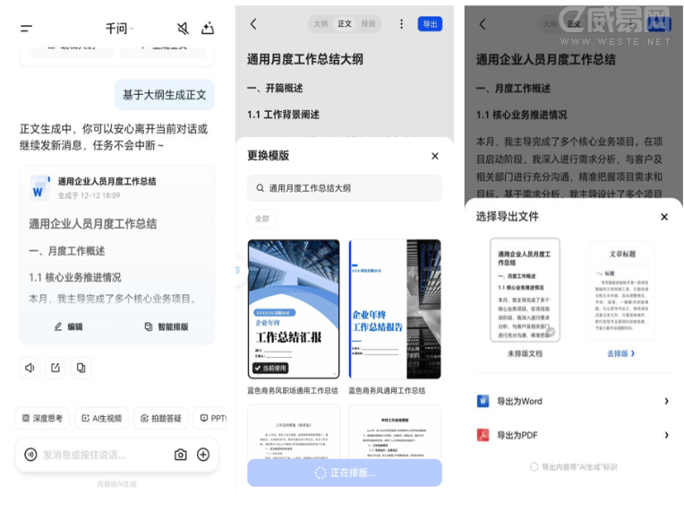 除此之外,小編體驗后還發(fā)現(xiàn)一個很實用的小細節(jié),千問 App 中生成文本內(nèi)容后,會自動同步生成文檔,支持直接導(dǎo)出為Word或PDF格式,而且可以更換不同模板,便于用戶進行內(nèi)容的分享與留存。