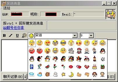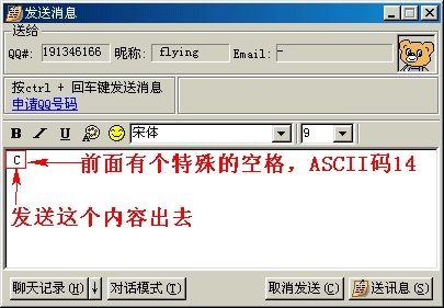 所以,我們只要在代表相應表情的字符前加上個ASCII碼14就可以了,在QQ中ASCII碼14看起來就是一個特殊的空格,我們無法直接輸入得到它。如果不用其他軟件,你可以這樣得到這個特殊的空格:給QQ好友發送一個表情,然后點“聊天記錄”按鈕,在聊天記錄里面就有那個符號。復制它到發送消息窗中,就得到了這個特殊的空格,F在輸入M試試(特殊空格復制到記事本中看起來就是黑方塊:),對方一定會收到一個吐舌頭的表情符號,呵呵!