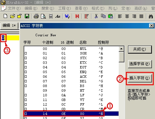 除此以外,你也可以這樣發送表情符號:打開16進制文件編輯器UltraEdit或WinHEX(以UltraEdit為例),點擊“查看”菜單中的“ASCII字符表”,選中ASCII字符14,直接雙擊或點擊“插入字符”按鈕就會插入該ASCII字符,在UltraEdit中你會文件中有一個方格,如圖2所示(圖2),