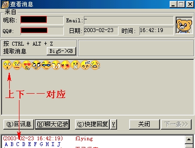 解釋一下:QQ的表情符號每一行有10個,它們和下面的字符是一一對應的(圖5):
