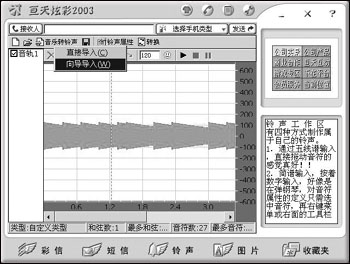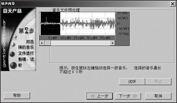 我們先打開自己準備好的音樂,點擊界面下方工具欄中的“鈴聲”按鈕,就出現如圖1的界面。在工具欄中選擇“音樂轉鈴聲→向導導入”。點擊“瀏覽”按鈕,選擇待轉換的音樂文件,然后點擊“下一步”,進行音頻剪輯。