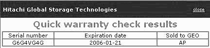 自從IBM硬盤部門被日立收購(gòu)后,IBM的硬盤逐漸淡出市場(chǎng),改頭換面為日立硬盤,并且日立公司承諾將繼續(xù)對(duì)IBM硬盤執(zhí)行既定的服務(wù)條款。網(wǎng)頁(yè)打開(kāi)后點(diǎn)擊“Warranty check”,進(jìn)入“Quick warranty check”頁(yè)面,在“Serial numbers”處輸入硬盤標(biāo)簽上的S/N號(hào)碼,點(diǎn)擊“Check”就可以得到該硬盤保修期滿日期(Expiration Date)、銷售區(qū)域(Sold to GEO)(圖7)。