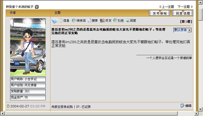 "當時“落伍者”和“IM268”兩個論壇的網友不斷發帖" 哈哈哈,笑掉大牙了! 無知啊~~~ 笑死了 IM286后邊加個.COM就是落伍者了 暈 |