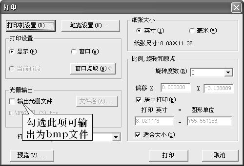 小技巧:在圖2中勾選“輸出光柵文件”項,就可以把CAD文件轉成BMP文件輸出。