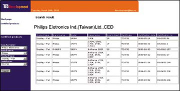 選擇完畢后按Search,就可列出相關(guān)產(chǎn)品的品牌名稱、型號(hào)、尺寸、通過認(rèn)證的類型、時(shí)間以及認(rèn)證代號(hào)等信息(見圖1)。