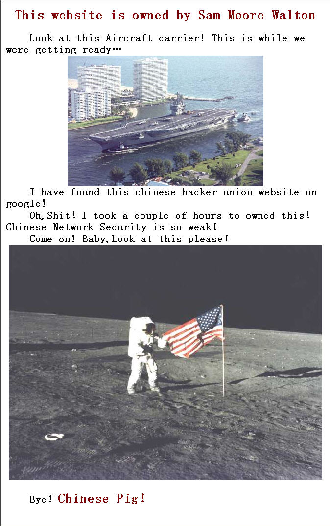這名叫Sam Moore Walton的黑客不僅把頁(yè)面標(biāo)題改成了“USA”,還在頁(yè)面上大放厥詞公開(kāi)辱罵國(guó)人,其卑劣行徑實(shí)在值得唾棄。從寫(xiě)著"USA"的頁(yè)面標(biāo)題、圖中的美國(guó)國(guó)旗來(lái)看,這名黑客很可能是美國(guó)人。最近網(wǎng)絡(luò)真是不太平,“黑客海岸線(xiàn)”作為一個(gè)黑客站點(diǎn)都被黑了,實(shí)在不得不令我們感到汗顏和擔(dān)心。