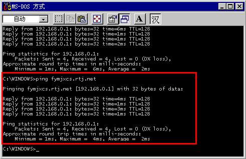 完成以上設(shè)置后,可在客戶端使用Ping命令測(cè)試任意二級(jí)域名解析是否成功。例如,在命令提示符下輸入“Ping fymjxcs.rtj.net”命令,得到如圖所示的響應(yīng)信息,就表示泛域名解析成功。