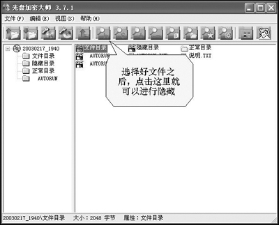 通常情況下我們制作隱藏文件是比較麻煩的,需要用一些二進制編輯器,而用光盤加密大師就簡單了。先選擇好要隱藏的文件和文件夾,然后點擊“屬性”欄中的“隱藏”屬性就可以直接進行隱藏操作(如圖2),非常的方便。