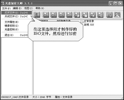 制作完ISO文件之后,接下來就可以用光盤加密大師打開(如圖1),執行菜單欄中的“文件→打開文件”命令,也可以直接單擊工具欄中的“打開光盤鏡像文件”按鈕,在隨后出現的文件選擇對話框中,選中事先制作好的光盤鏡像文件,這樣鏡像文件中的所有內容,將自動顯示在主界面右邊的子窗口中。光盤加密大師采用了多種加密方法,可以根據自己的實際需要來進行選擇。