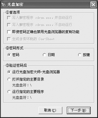 上面的每種加密方式都很實用,要是能綜合使用的話,加密的效果更加出色。而且使用光盤加密大師還可以設置光盤密碼,這樣只有輸入正確的密碼才能訪問光盤的內容。在光盤加密大師中有四種密碼方式,分別是普通密碼、日期加密、按鍵加密和熱點加密四種(如圖4),這里可以根據實際的需要來選擇。設置完密碼之后,還可以選擇是直接打開指定的主要目錄,還是直接打開指定的主要程序,或者是直接運行光盤加密大師中的光盤瀏覽器。