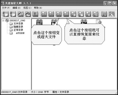 在光盤加密大師里面將目錄變成文件目錄也很簡單,選擇好要加密的文件夾,然后點擊“文件變為文件目錄”按鈕就可以自動進行加密,要恢復的話,點擊右邊恢復按鈕即可。