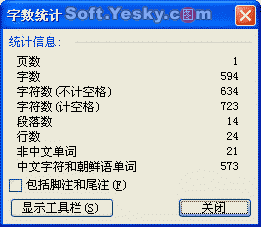 經常寫文章的朋友都需要隨時在寫作過程中查看文章的字數,如何最快速的知道整篇文章到底有多少字呢?方法是點“工具”菜單里的“字數統計”,文章到底包含多少字、多少字符就全出來了,而且還分帶空格和不帶空格兩種信息。如圖1。